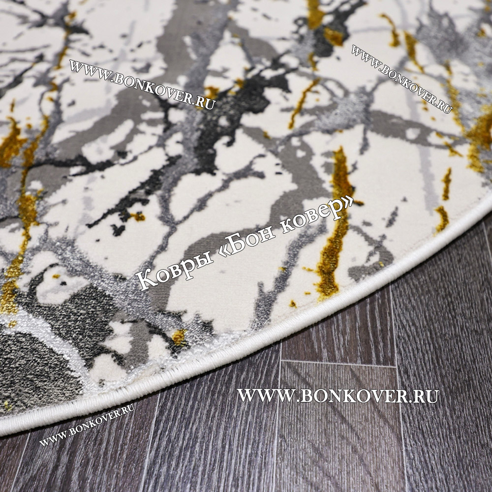 Изящный Турецкий Абстрактный Ковер Белый с Золотистым Арт 30325 наполняет интерьер квартиры теплом и уютом, гармонично сочетает в себе изящество и стиль. Он соткан из высококачественного сырья, прочный и долговечный.
